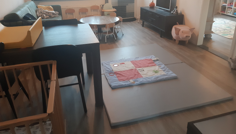 Er is voor de kinderen een aparte speelkamer waar de kinderen volop kunnen spelen. Buiten spelen vind ik ook erg belangrijk. We proberen iedere dag minstens één keer naar buiten te gaan. Ook al is het slecht weer, we hebben buitenspeelpakken die waterdicht en lekker warm zijn, dus dat houdt ons niet tegen.